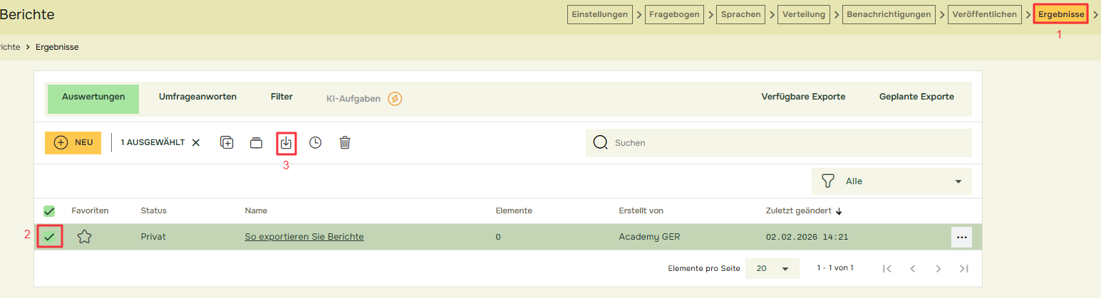Sie können Ihre Berichte entweder aus der Berichtsliste in Ergebnisse(1) exportieren, indem Sie den gewünschten Bericht(2) auswählen und auf die Schaltfläche Export(3) klicken: