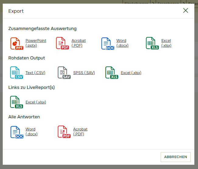 Nachdem Sie auf „Export“ geklickt haben, können Sie das gewünschte Ausgabeformat auswählen. Wenn Sie unsicher sind, macht es Sinn mehrere Exporte in verschiedenen Formaten auszuprobieren, da es keine Grenzen für Ihre Exporte gibt. Wir bieten die folgenden Ausgabearten an: