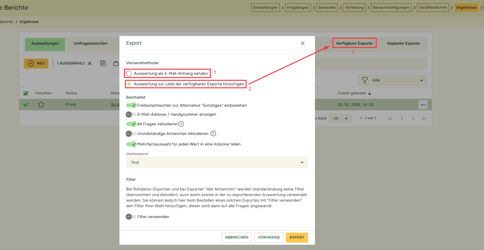 Sie können wählen, ob Sie (1) „Freitextantworten zur Alternative „Sonstiges“ einbeziehen“ und die „E-Mail-Adresse / Handynummer anzeigen“ im Abschnitt Enthält einbeziehen möchten: