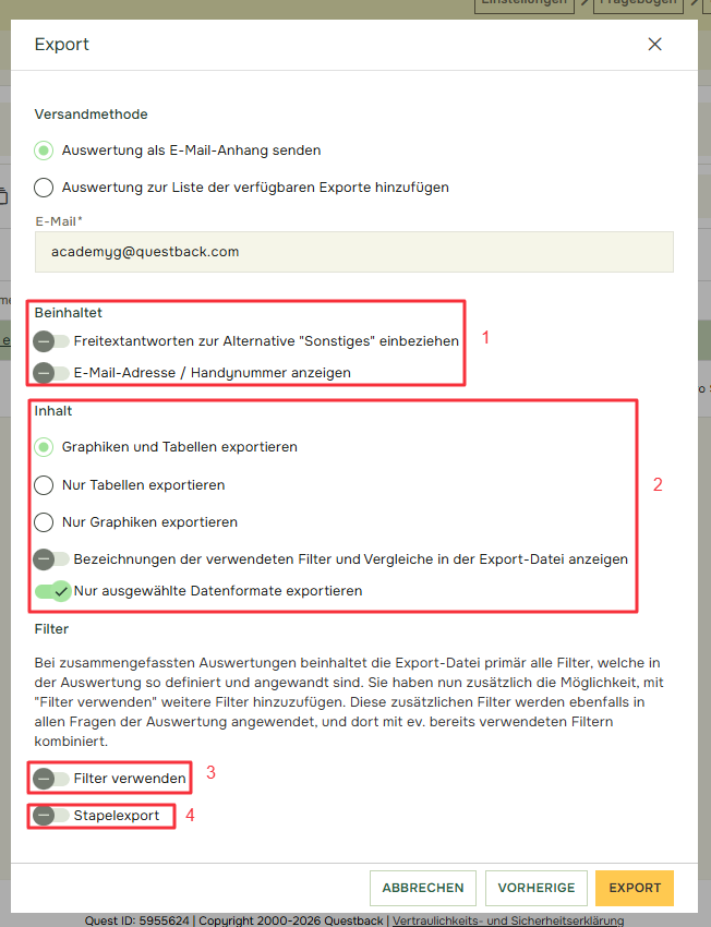 Wenn Sie Stapelexport (4) wählen, können Sie mehrere Filter auswählen und erhalten für jeden ausgewählten Filter einen Bericht, der nach dem jeweiligen Filter gefiltert ist: