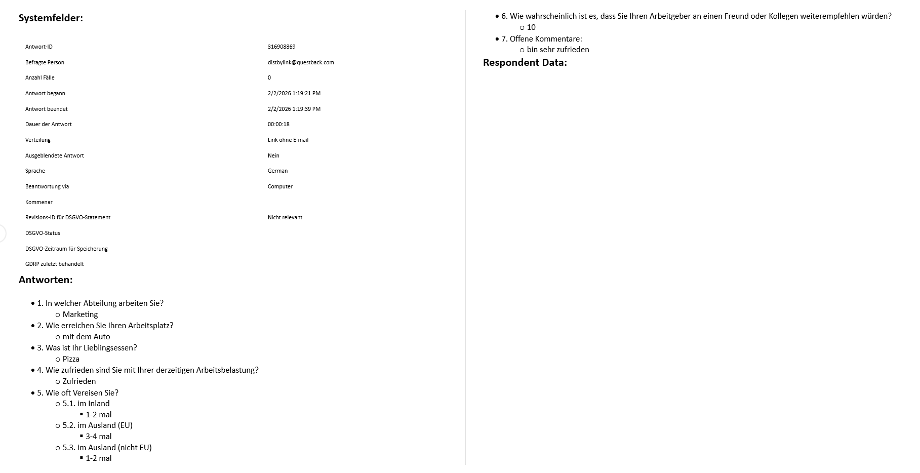 – Alle Antworten: Dies enthält alle einzelnen Antwortformulare, die in einer fortlaufenden Ansicht dargestellt werden. Bitte beachten Sie, dass nur die im Bericht angezeigten Antworten enthalten sind, d.h. Antworten, die durch einen angewandten Filter verworfen wurden, sind in diesem Bericht nicht enthalten. Dies ist eine hervorragende Möglichkeit, die Antworten der einzelnen Befragten durchzugehen, und kann sehr praktisch für Quests sein, die für Bewerbungen, Quiz oder Anmeldungen verwendet werden: