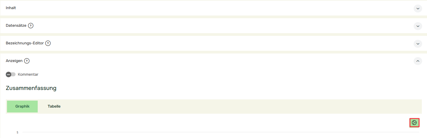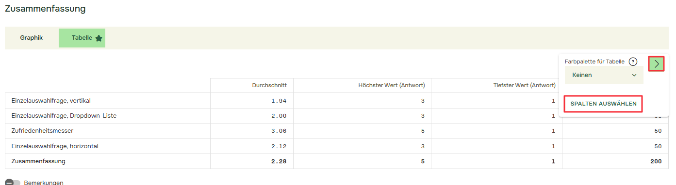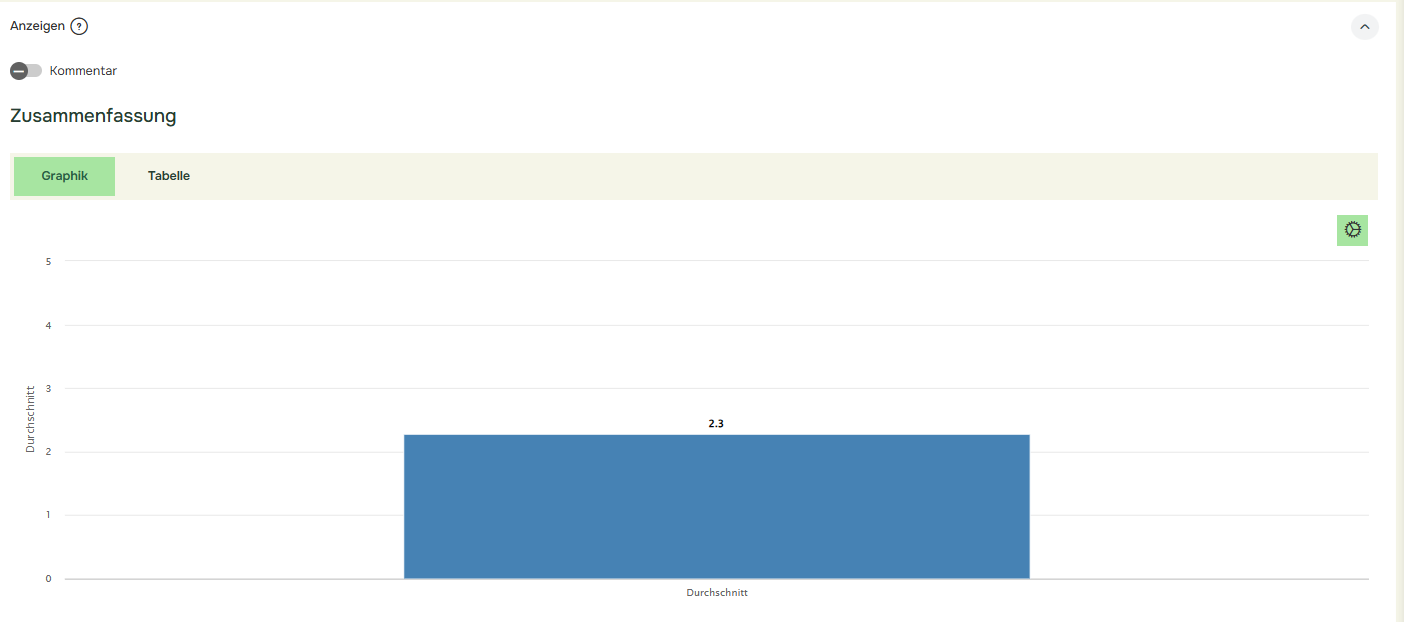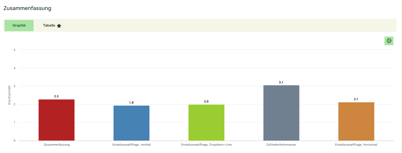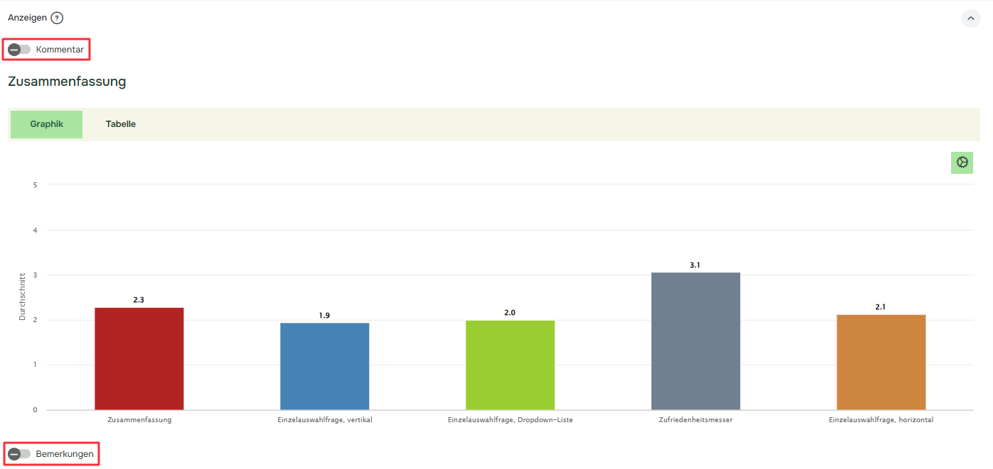 Daten anzeigen als zeigt die Daten als Durchschnittswerte (pro Frage + Zusammenfassung) an, da dies der einzige verfügbare Datentyp für Zusammenfassungen ist.