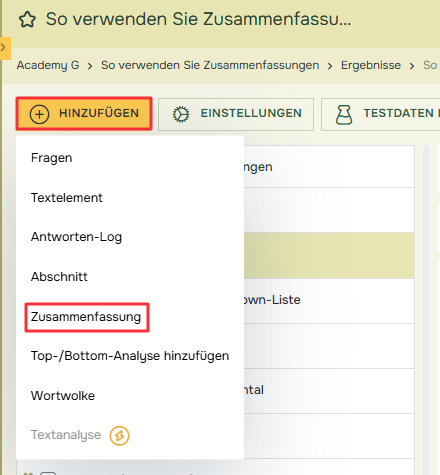 Um eine Zusammenfassung innerhalb eines Berichts hinzuzufügen, klicken Sie auf Hinzufügen und dann auf Zusammenfassung.