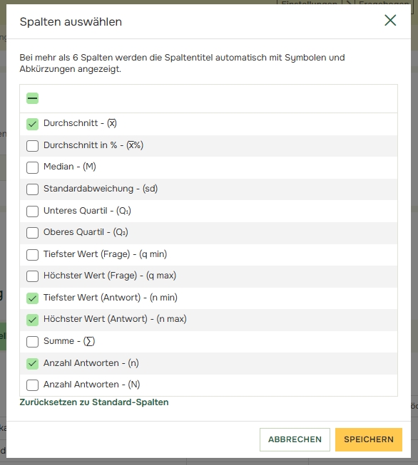 Wenn Sie auf Spalten auswählen klicken, öffnet sich dieses Popup-Fenster: