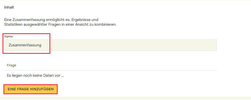 Geben Sie der Zusammenfassung einen Namen. Klicken Sie dann auf Eine Frage hinzufügen, um zu entscheiden, welche Fragen Sie in die Zusammenfassung aufnehmen möchten: