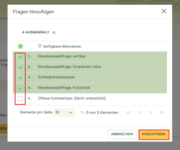Fragetypen, die nicht unterstützt werden, sind in der Frageliste mit (Nicht unterstützt) gekennzeichnet. Die Fragetypen, die nicht unterstützt werden, sind: