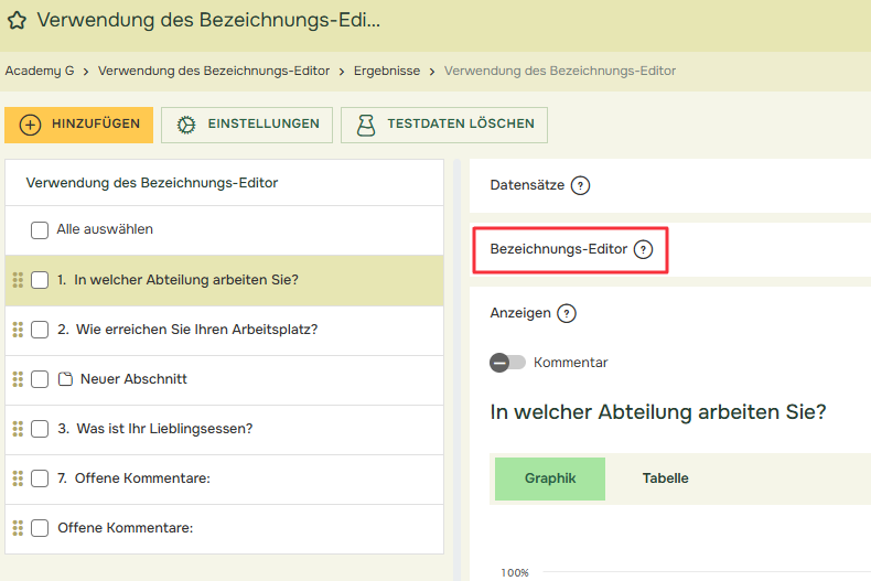 Wenn Sie sich im Bericht befinden, haben Sie Zugriff auf das Menü Bezeichnungs-Editor. Mit dem Bezeichnungs-Editor können Sie die Etiketten im Diagramm nach Belieben ändern.