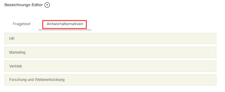 Um die Antwortalternativen zu bearbeiten , gehen Sie auf die Registerkarte Antwortalternativen und schreiben Sie die gewünschten Bezeichnungen in die Textfelder.
