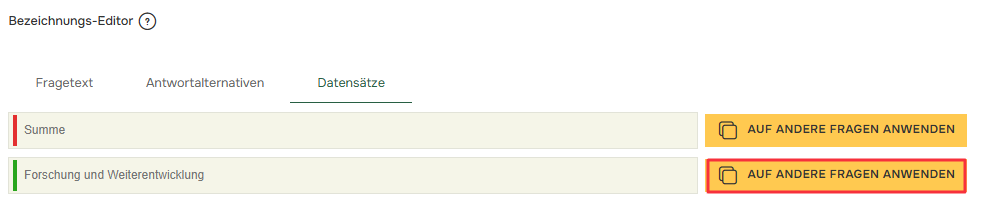 Wenn Sie einen Vergleich für mehrere Fragen verwendet haben, können Sie die Namen in den Datensätzen für alle Fragen mit demselben Vergleich einfach ändern, indem Sie die Schaltfläche Auf andere Fragen anwenden klicken.