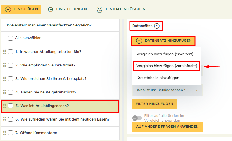 Um einen Vereinfachten Vergleich zu erstellen, müssen Sie die gewünschte Frage in Ihrem Bericht auswählen, das Menü Datensätze öffnen, dann auf Datensatz hinzufügen klicken und Vergleich hinzufügen (vereinfacht) auswählen.