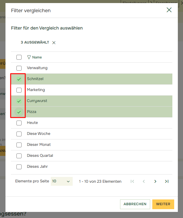 Anschließend wählen Sie die Filter aus, die Sie für den Vergleich verwenden möchten: