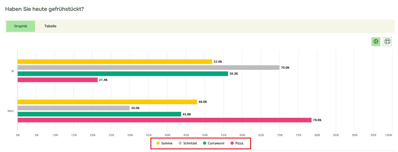 Nach dem Hinzufügen der Vergleiche werden in Ihren Diagrammen die ausgewählten Filter verglichen, einschließlich der Summe (Gesamtzahl für alle Befragten):