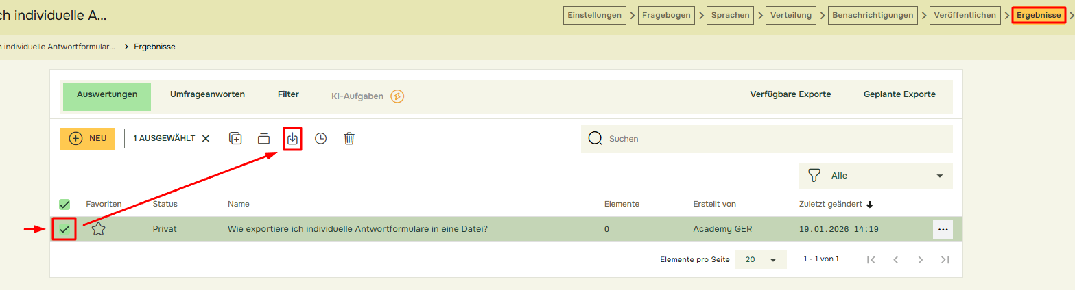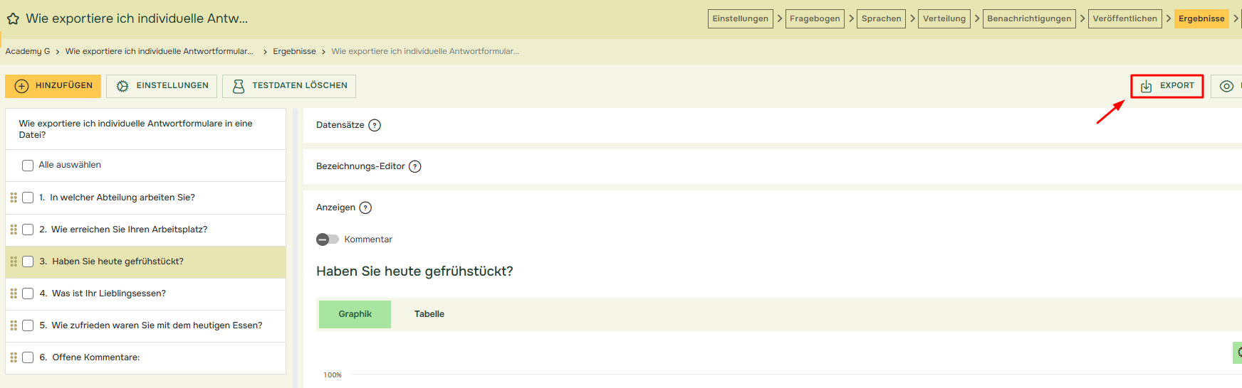 Individuelle Antwortformulare sind nützlich, um zu analysieren, was jeder einzelne Befragte geantwortet hat. Um einzelne Antwortformulare zu exportieren, gehen Sie zu Ergebnisse, wählen Sie dann a) Ihren Bericht in der Berichtsübersicht aus (und klicken Sie auf Exportieren) oder b) öffnen Sie den Bericht und klicken Sie dann auf Exportieren: