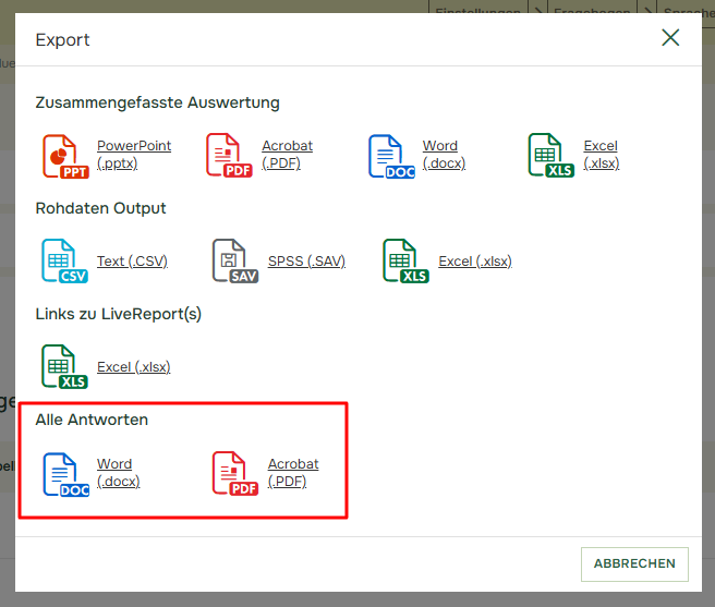 Wählen Sie in der Übersicht der Exportberichte unter Alle Antworten entweder Word oder PDF aus: