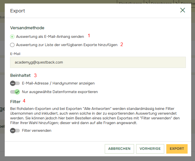 Sie können die Datei entweder per E-Mail an sich selbst (oder einen Kollegen) schicken (1) oder über einen sicheren Link herunterladen (2). Sie können wählen, ob Sie die E-Mail-Adressen und Telefonnummern der Befragten in unsere Datei aufnehmen oder ausschließen möchten (3) sowie ob Sie nur ausgewählte Datenformate exportieren wollen. Zusätzlich können Sie dem generierten Bericht auch (zuvor erstellte) Filter hinzufügen (4).