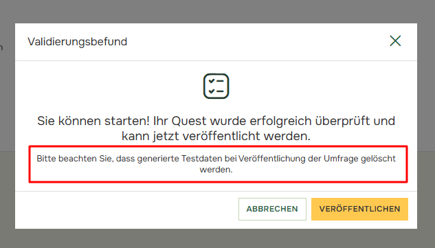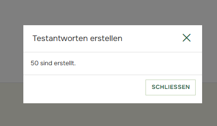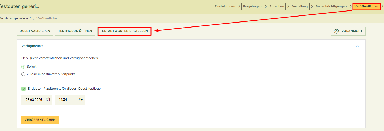 Das Generieren von Testantworten kann eine gute Möglichkeit sein, sich mit dem Berichterstellungstool vertraut zu machen, bevor Sie Antworten erhalten. Es ist sinnvoll, verschiedene Layouts des Berichts zu testen und Ihre Filter und Vergleiche zu überprüfen. Sie können Testantworten über „Veröffentlichen” erstellen, indem Sie auf „Testantworten erstellen” klicken: