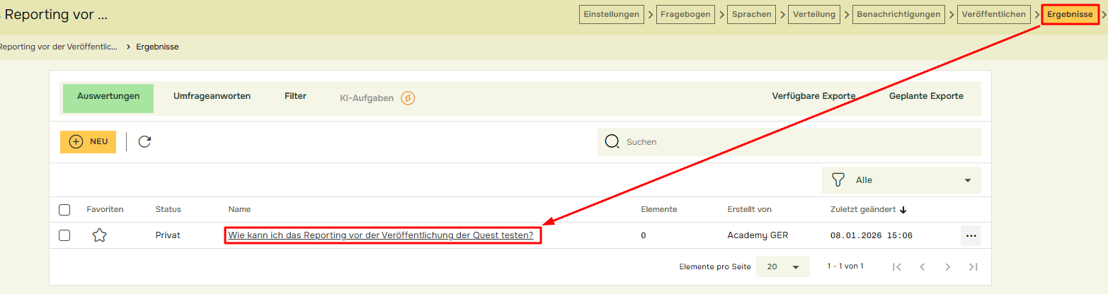 Wie kann ich das Reporting vor der Veröffentlichung der Quest testen?