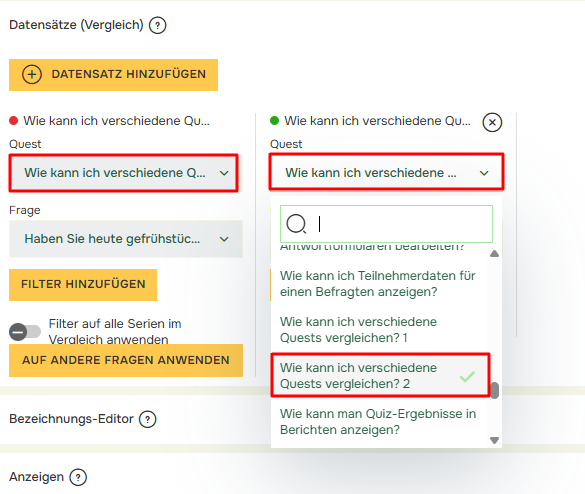 Im Dropdown-Menü unter „Quest“ können Sie eine andere Quest suchen und auswählen. Wenn Sie weitere Quests vergleichen möchten, wiederholen Sie einfach die Schritte (Datensatz hinzufügen und Vergleich hinzufügen (erweitert)):
