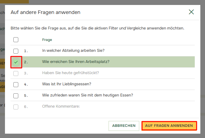 Um den Vergleich auf mehrere Fragen in Ihrem Bericht anzuwenden, können Sie auf die Schaltfläche Auf andere Fragen anwenden klicken: