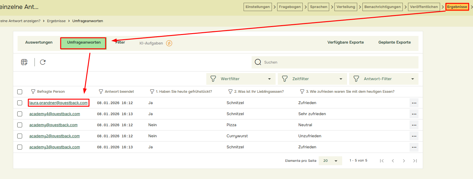 Unter der Registerkarte „Ergebnisse“ im Bereich „Antworten“ können Sie einzelne Antworten abrufen, indem Sie auf die E-Mail-Adresse eines bestimmten Befragten in der Liste klicken: