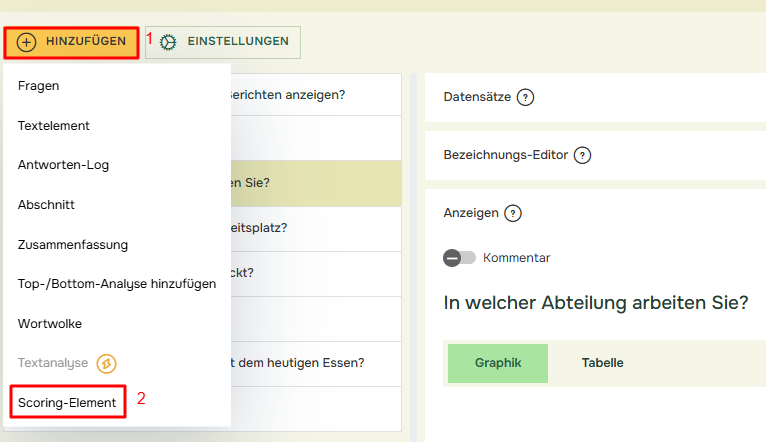 Im Bericht können Sie die Punktzahlen der Befragten und die Punktzahlstatistik einsehen. Zunächst müssen die Objekte für die Punktzahlen und Statistiken hinzugefügt werden. Klicken Sie dazu auf die grüne Plus-Schaltfläche (1) und wählen Sie Punktzahl hinzufügen (2).