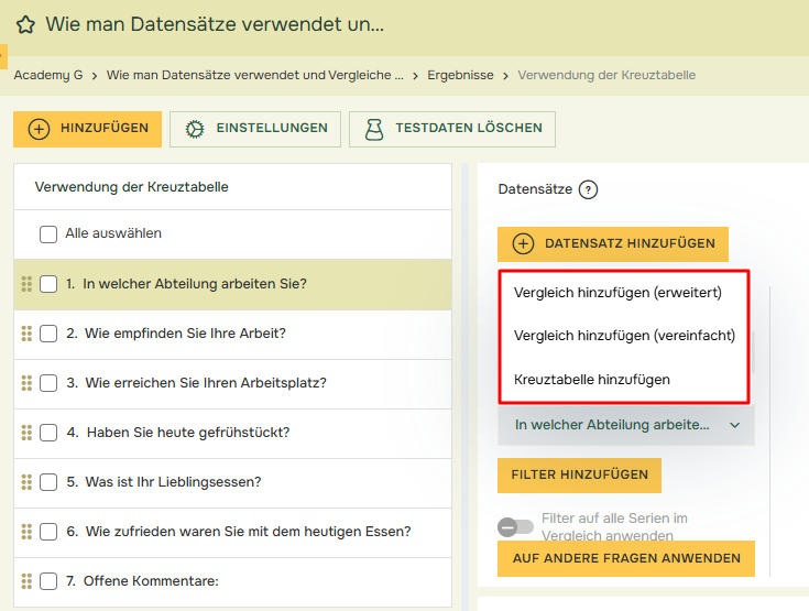 Anschließend können Sie zwischen dem Hinzufügen eines erweiterten oder vereinfachten Vergleichs oder einer Kreuztabelle wählen: