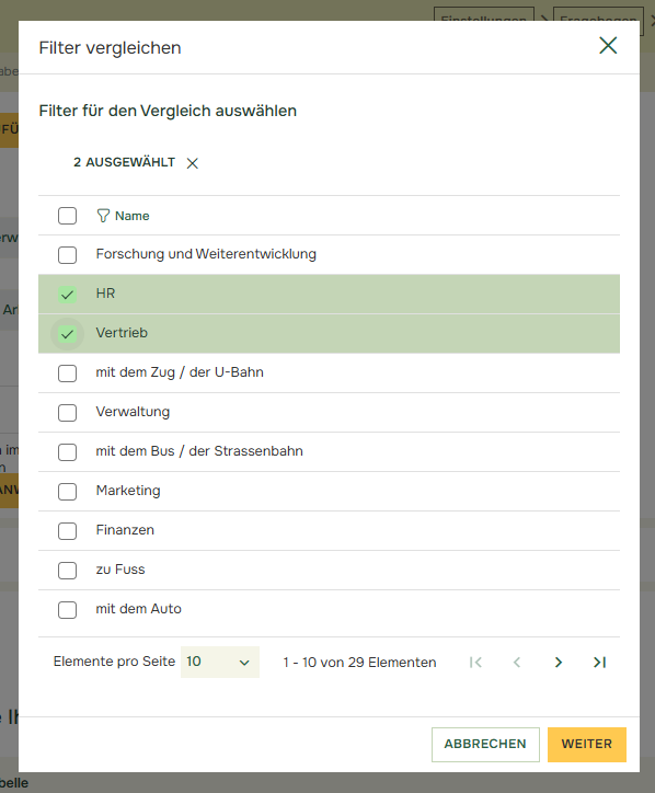 Mit Vergleich hinzufügen (vereinfacht) können mehrere Datensätze gleichzeitig unter Verwendung verschiedener Filter hinzugefügt werden. Auf diese Weise lassen sich verschiedene Filter aus derselben Quest oder aus verschiedenen Quests schnell miteinander vergleichen. Wenn Sie auf „Vergleich hinzufügen (vereinfacht)” klicken, öffnet sich ein neues Fenster, in dem Sie die gewünschten Filter auswählen können: