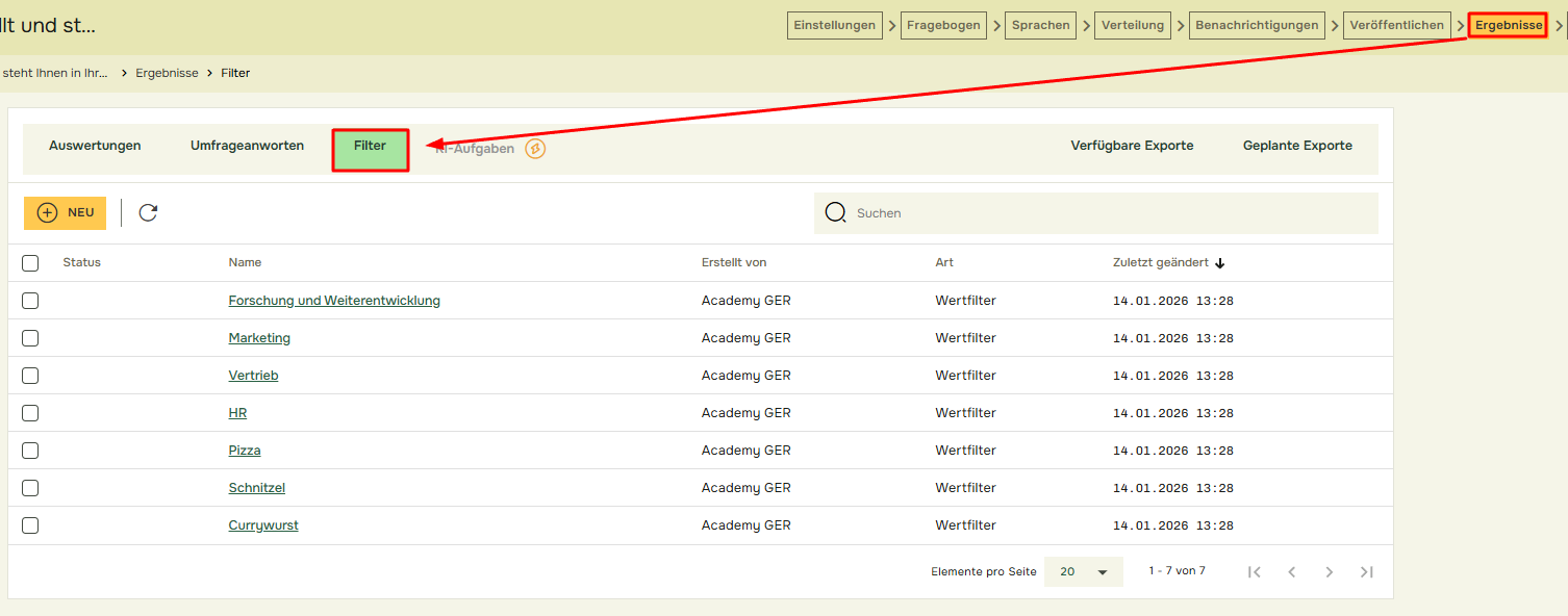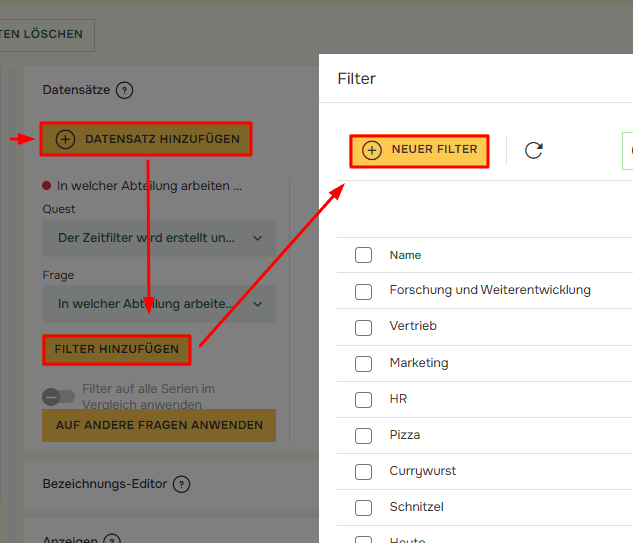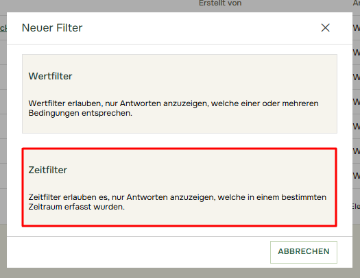 Wenn Sie die Befragten nach dem Zeitpunkt ihrer Antwort gruppieren möchten, ist die Verwendung von Zeitfiltern praktisch. Sie können einen neuen Zeitfilter entweder über das Menü Ergebnisse > Filter „+Neu“ oder durch Klicken auf „+Neu Neuer Filter“ im Menü Datensätze unter „Filter hinzufügen“ innerhalb einer bestimmten Frage im Bericht selbst erstellen: