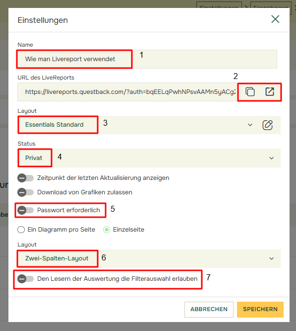 Wenn Sie den LiveReport mit jemandem teilen möchten, müssen Sie sicherstellen, dass Sie den Status Öffentlich (4) gewählt haben. Wenn der Status Privat ist, haben nur Sie Zugriff auf den LiveReport.