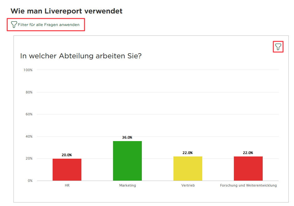 Ändern Sie die Filter im LiveReport: vergewissern Sie sich, dass Sie wie oben beschrieben „Den Lesern der Auswertung die Filterauswahl erlauben“ aktivieren. Klicken Sie dann innerhalb des LiveReports auf die Schaltfläche Filter entweder rechts oben in jeder Grafik oder Links oben im Report.