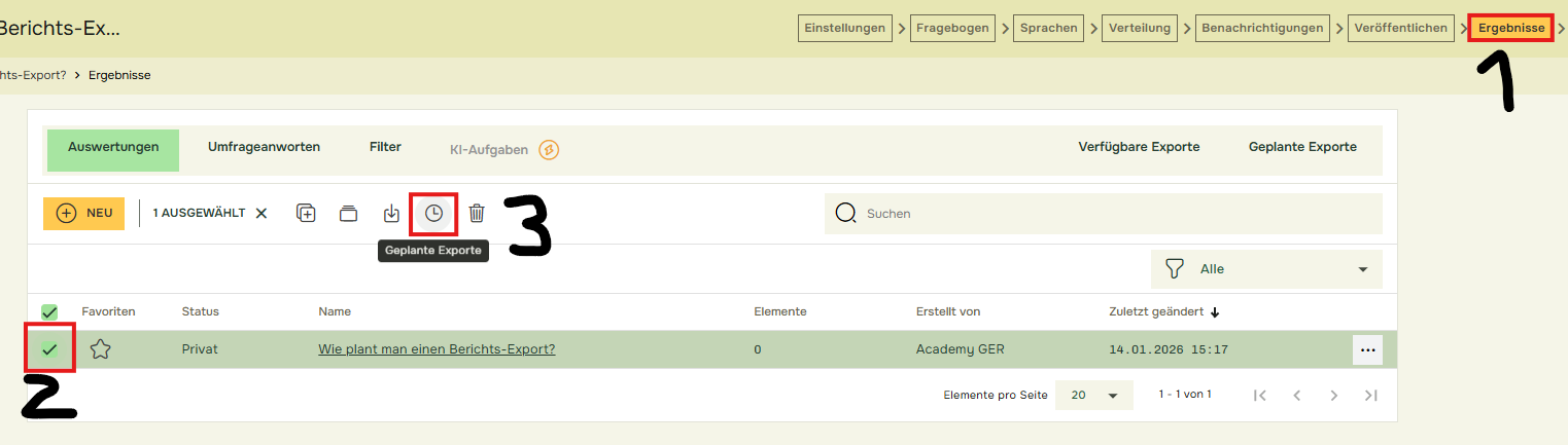 Gehen Sie zu „Ergebnisse (1)“, wählen Sie den „Bericht (2)“ aus, den Sie planen möchten, und klicken Sie auf die Schaltfläche „Geplante Exporte(3)“.