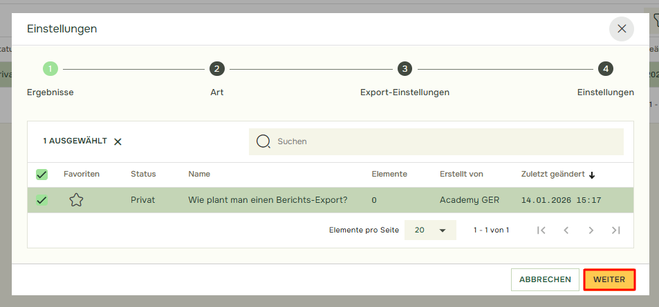 Es öffnet sich ein neues Fenster, in dem Sie einen Überblick über Ihre Berichte erhalten. Hier können Sie den Bericht, den Sie planen möchten, hinzufügen oder ändern. Wenn Sie den Bericht ausgewählt haben, den Sie planen möchten, klicken Sie bitte auf „Weiter“.