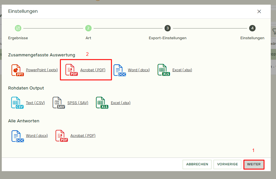 Wählen Sie das gewünschte Dateiformat(2) für den Bericht, für den Sie einen Export planen möchten, und klicken Sie auf Weiter(1).