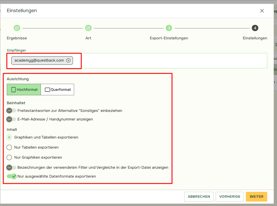 Bitte geben Sie in diesem Fenster die E-Mail-Adresse an, an die der Bericht gesendet werden soll, wählen Sie die gewünschten Optionen für den Bericht aus und klicken Sie auf „Weiter“.