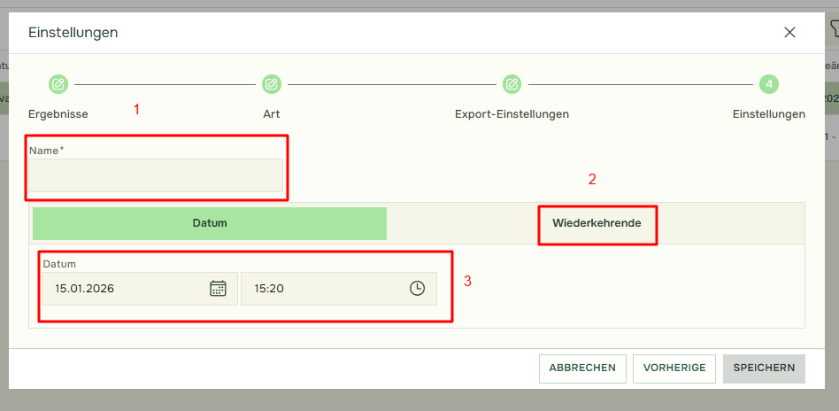 Geben Sie dem Export einen passenden Namen(1), wählen Sie aus, ob der Export wiederkehrend(2) oder einmalig zu einem bestimmten Datum/einer bestimmten Uhrzeit erfolgen soll, und legen Sie das Datum/die Uhrzeit(3) fest.