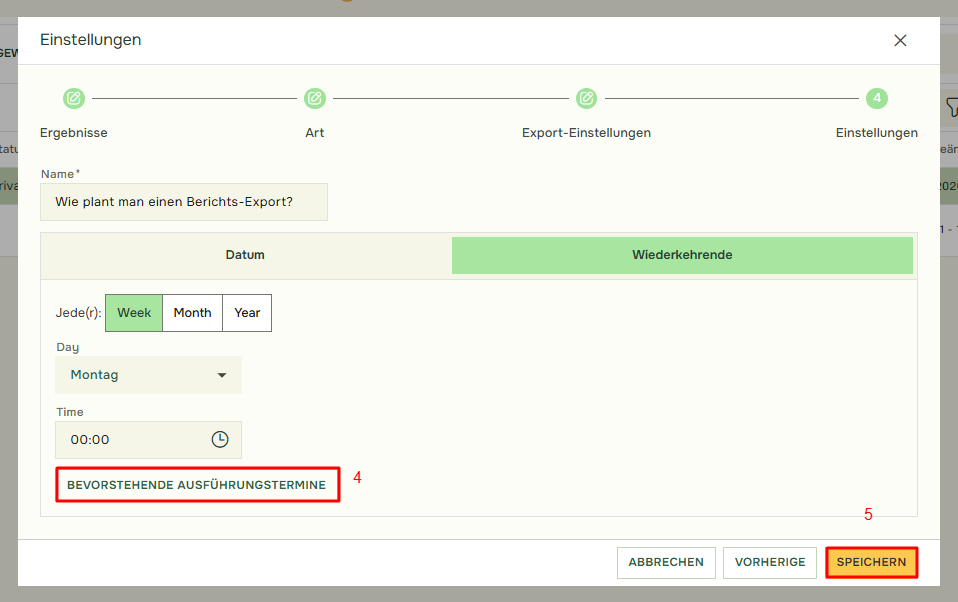 Klicken Sie auf Bevorstehende Ausführungstermine(4), um einen Zeitplan für den Export des Berichts anzuzeigen, und klicken Sie anschließend auf Speichern(5).