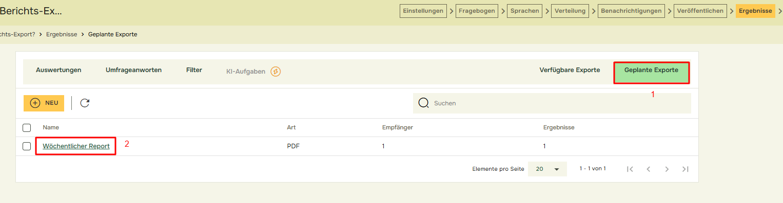 Um den geplanten Export anzuzeigen oder zu ändern, navigieren Sie bitte zu „Geplante Exporte“ und klicken Sie auf den Bericht, um ihn anzuzeigen oder zu ändern.