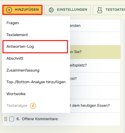 Um den Antworten-Log hinzuzufügen, öffnen Sie Ihren Bericht, klicken Sie auf „Hinzufügen“ und „Antworten-Log“: