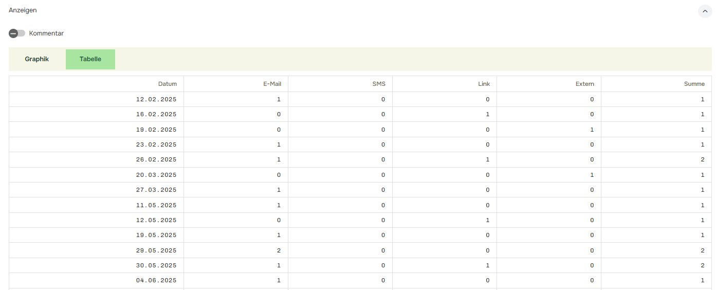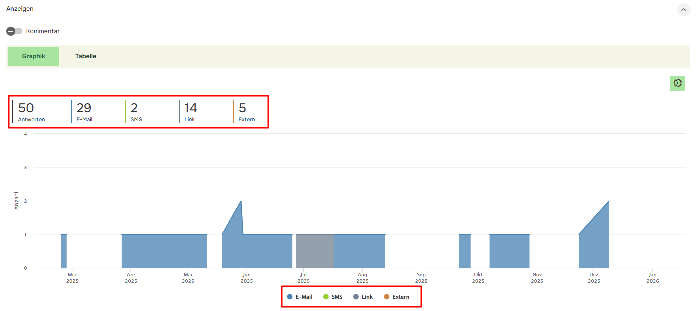 Der Antworten-Log zeigt die Gesamtzahl der Beantwortungen an und schlüsselt die Anzahl der Beantwortungen nach Medium auf (E-Mail, SMS, Link oder Extern (Dynamischer Link)). Das resultierende Antwortprotokoll kann als Diagramm angezeigt werden, entweder als „gestapelte Fläche“, ‚Linie‘ oder „gestapelte Spalte“: