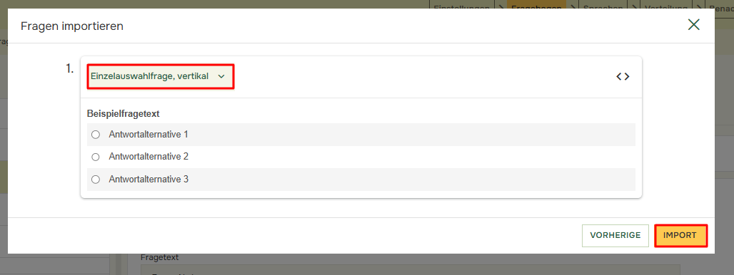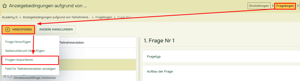 - Klicken Sie in Fragebogen auf die Schaltfläche „Hinzufügen” und anschließend auf „Fragen importieren”.