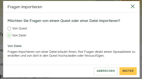 Im Fragebogen haben Sie die Möglichkeit, Fragen entweder aus einer Excel-Datei oder aus einer anderen Quest zu importieren. Dieser Artikel befasst sich mit dem Import von Fragen aus einer Excel-Datei.