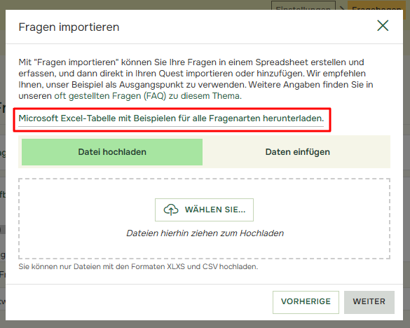 - Klicken Sie auf Microsoft Excel-Arbeitsblatt mit Beispielen für alle Fragetypen herunterladen, um zu sehen, wie Sie die Datei erstellen müssen.