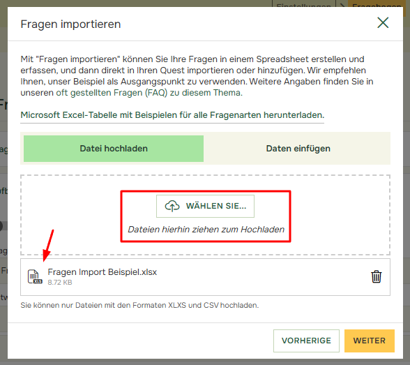 - Laden Sie die Datei hoch und klicken Sie auf Weiter.
