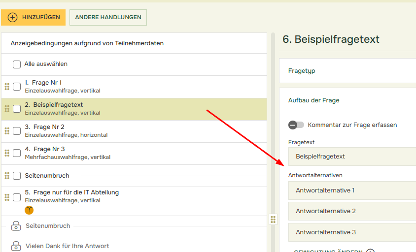 - Im nächsten Fenster erscheint eine Vorschau der hinzugefügten Fragen und Alternativen. Hier können Sie auch zwischen anderen Fragetypen wechseln, die mit der Frage kompatibel sind. Vergewissern Sie sich, dass alles korrekt ist, und klicken Sie auf Hinzufügen.
