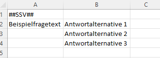 - Erstellen Sie die Excel-Datei unter Verwendung der Fragecodes, wobei der Fragetext unten steht und die Antwortmöglichkeiten in der nächsten Spalte folgen. Beispiel: