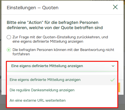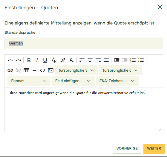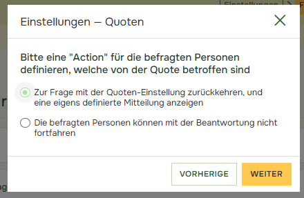 Wenn Sie „Zur Frage mit der Quoten-Einstellung zurückkehren, und eine eigens definierte Mitteilung anzeigen“ auswählen, können Sie im nächsten Schritt eine benutzerdefinierte Meldung schreiben. Klicken Sie auf „Weiter“ um diese Nachricht zu schreiben.