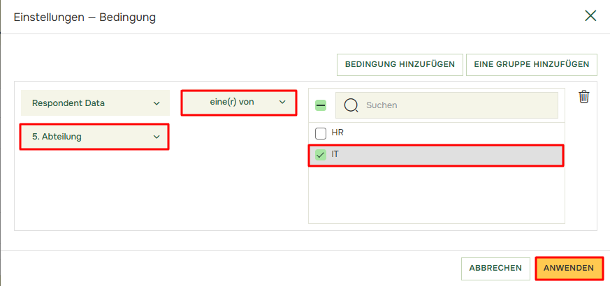 Im nächsten Fenster können Sie die Bedingung festlegen: Wir möchten, dass nur Befragte aus der IT-Abteilung die ausgewählte Frage beantworten: