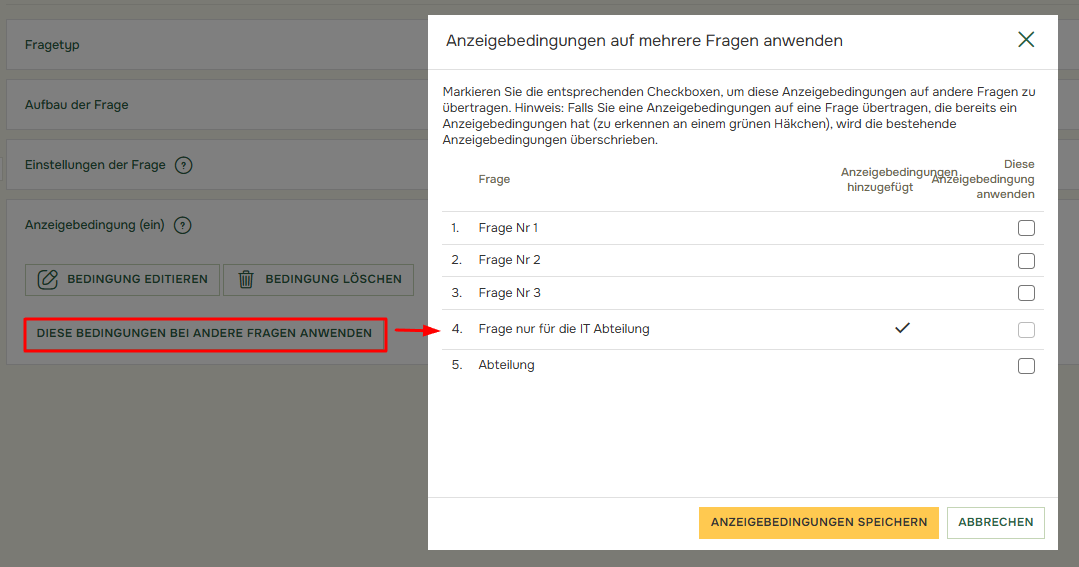 Um dieselben Anzeigebedingungen auf andere Fragen anzuwenden, klicken Sie einfach auf „Auf andere Fragen anwenden“.