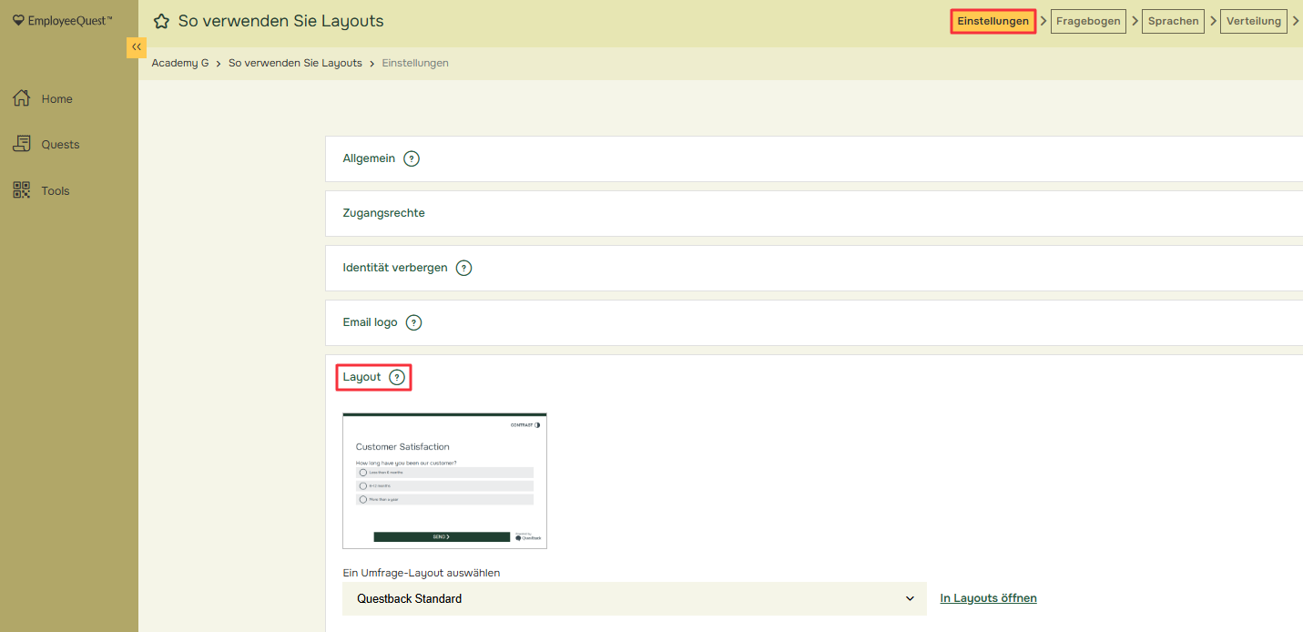 Unter dem Reiter „Einstellungen“ in Ihrer Quest finden Sie das Layout.