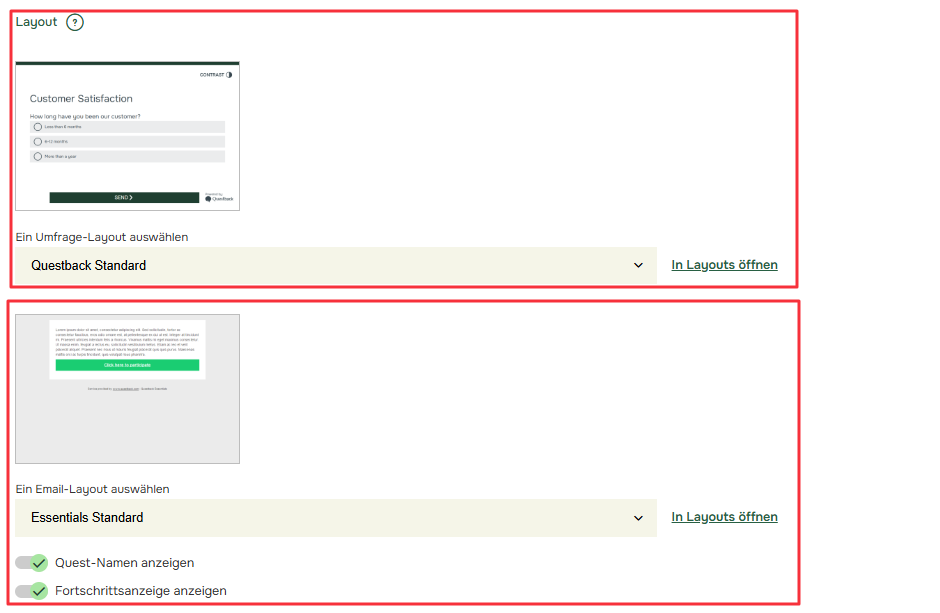 Hier können Sie ein Layout für Ihre Quest (Umfrage-Layout) sowie ein Layout für Ihre E-Mails (Email-Layout) auswählen. Unsere große Auswahl an Standard-Layouts ist in dem Dropdown-Menüs verfügbar, dort finden Sie auch Ihre eigenen Layouts.